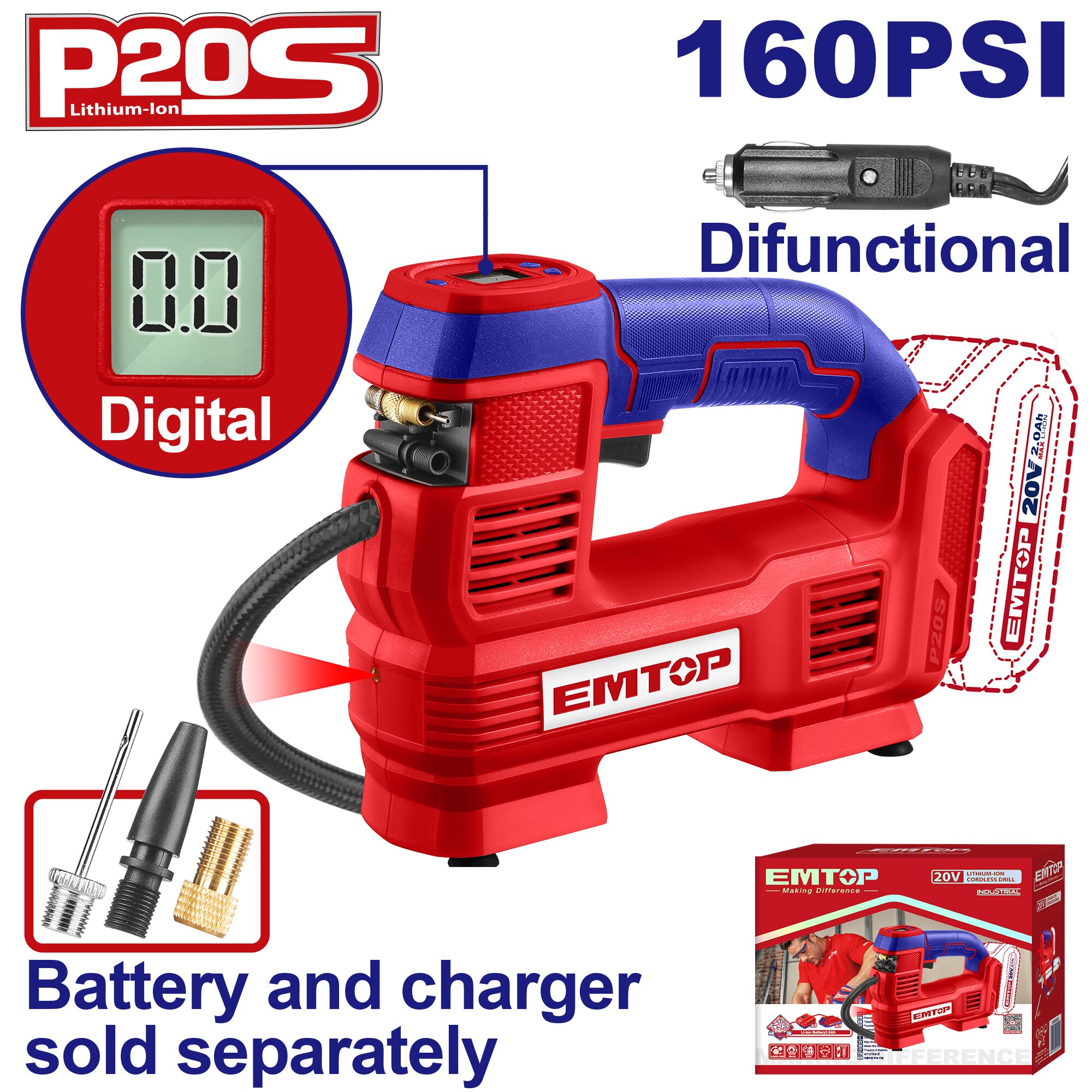 ¡Te lo enviamos a tu hogar!- El Compresor Inalámbrico EMTOP 20V (ELAC2012) ofrece potencia y portabilidad para inflar neumáticos, pelotas y todo tipo de inflables con rapidez y precisión. Alcanza hasta 160 PSI, cuenta con pantalla digital, apagado automático y un diseño compacto ideal para llevar en el auto o usar en el taller.