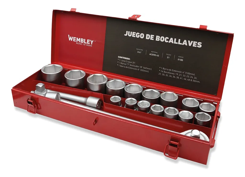 ¡Te lo enviamos a tu hogar!- Este artículo es un juego de bocallaves de encastre 3/4″ de la marca Wembley, diseñado para trabajos mecánicos y de mantenimiento pesado.