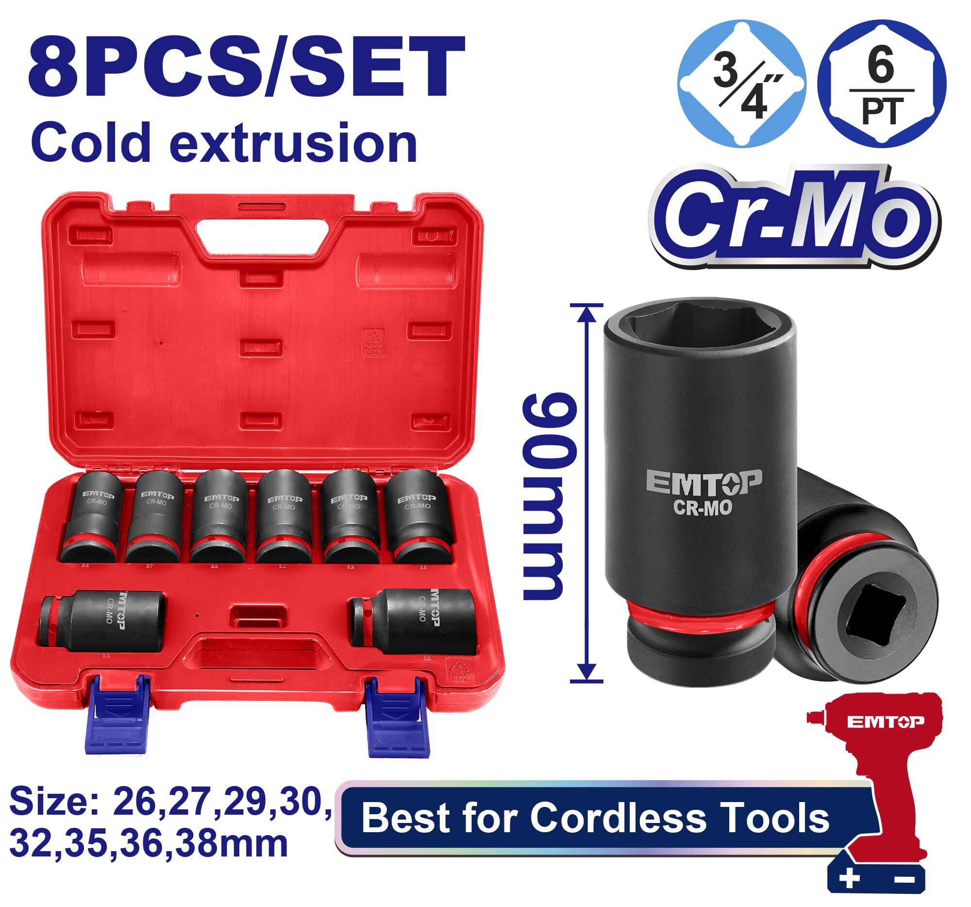 - Juego de 8 piezas de tubos de impacto profundos 3/4″DR