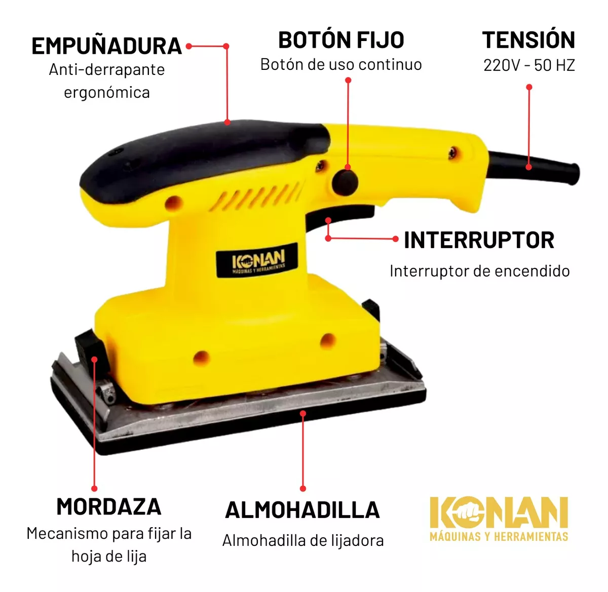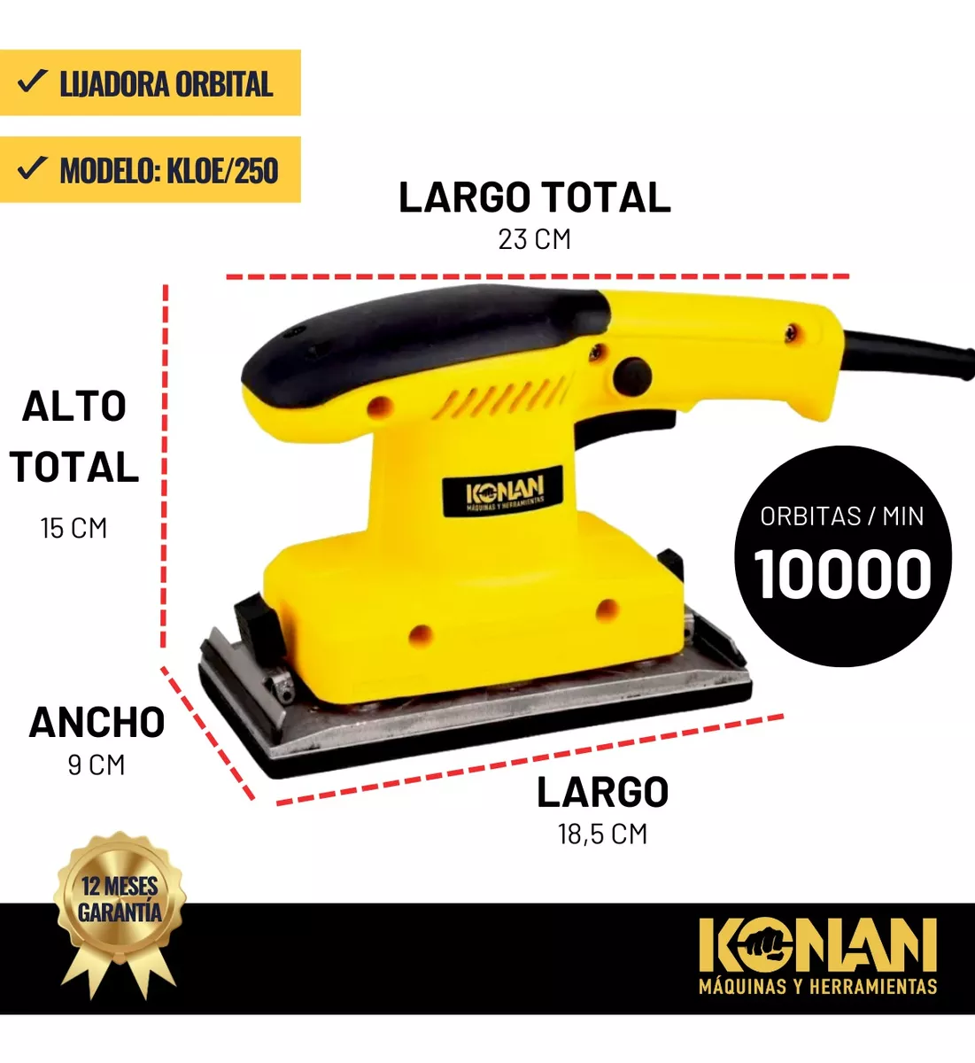 ¡Te lo enviamos a tu hogar!- La lijadora orbital KONAN es una herramienta eléctrica portátil que se utiliza para lijar y pulir superficies de manera eficiente y uniforme. Es ideal para trabajar en superficies planas, curvas y con bordes. Sus principales usos son: lijar superficies de madera, eliminar imperfecciones, refrescar superficies, lijado de metal y plástico, eliminar óxido y pintura, etc.